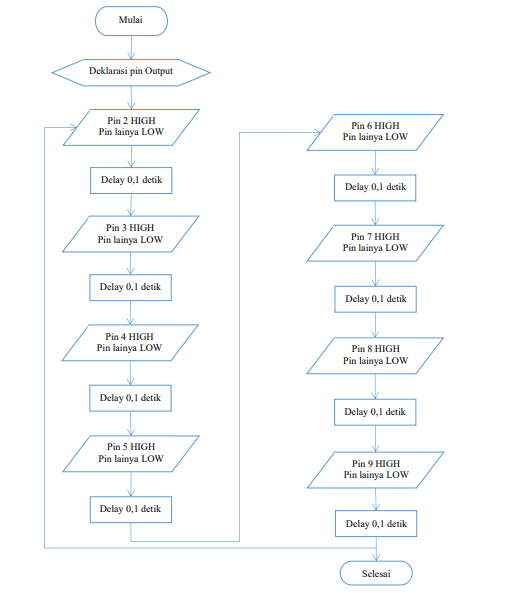 Prinsip kerja dari rangkaian adalah menggunakan sistem gerbang logika. Ketika LED diberi input berlogika 0 atau low maka lampu akan redup sedangkan ketika LED diberi input berlogika 1 atau high maka lampu akan menyala.Untuk mengontrol lampu hidup bergantian secara berulang dari kiri ke kanan ,maka diinput coding program pada arduino sesuai dengan kondisi yang diinginkan.